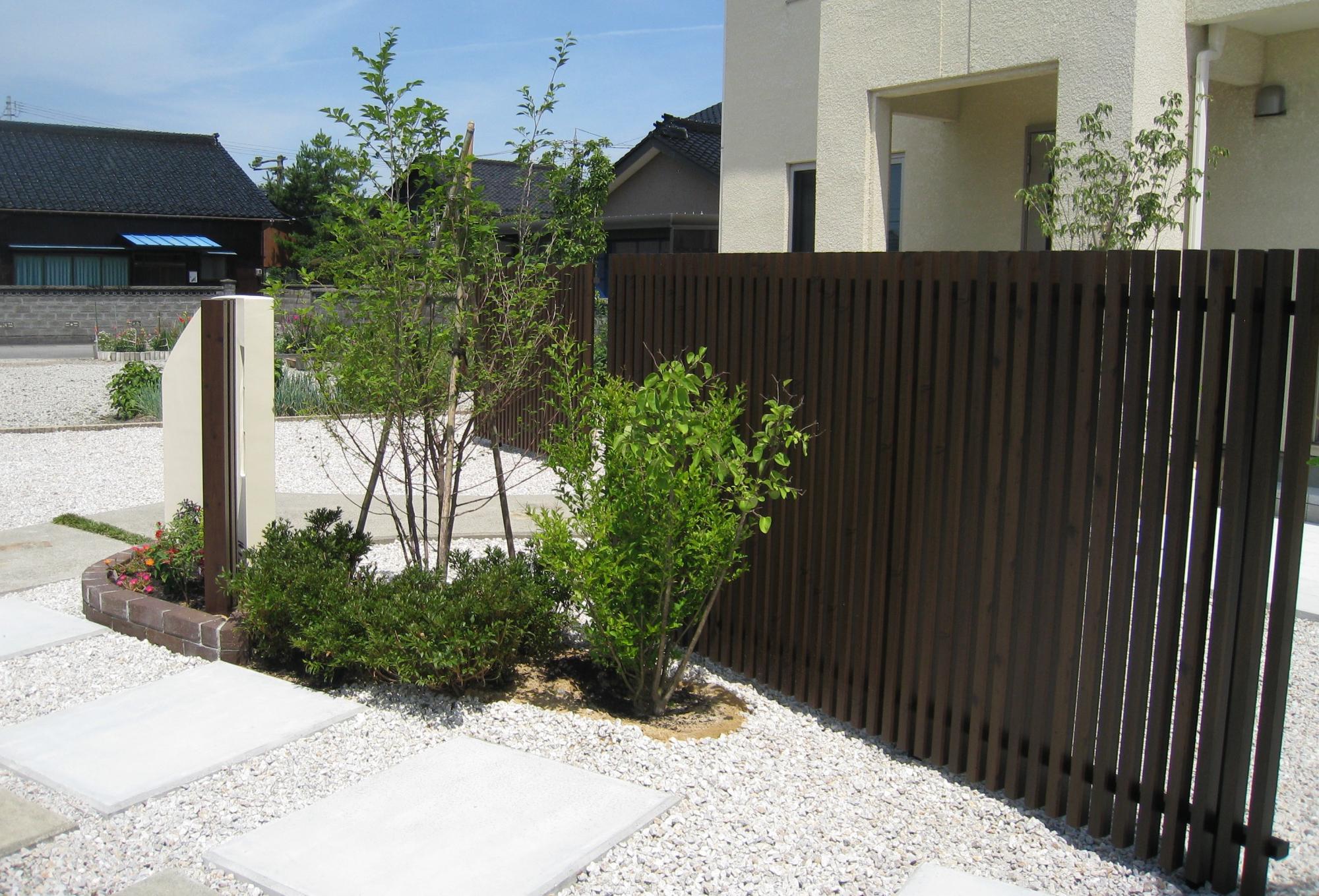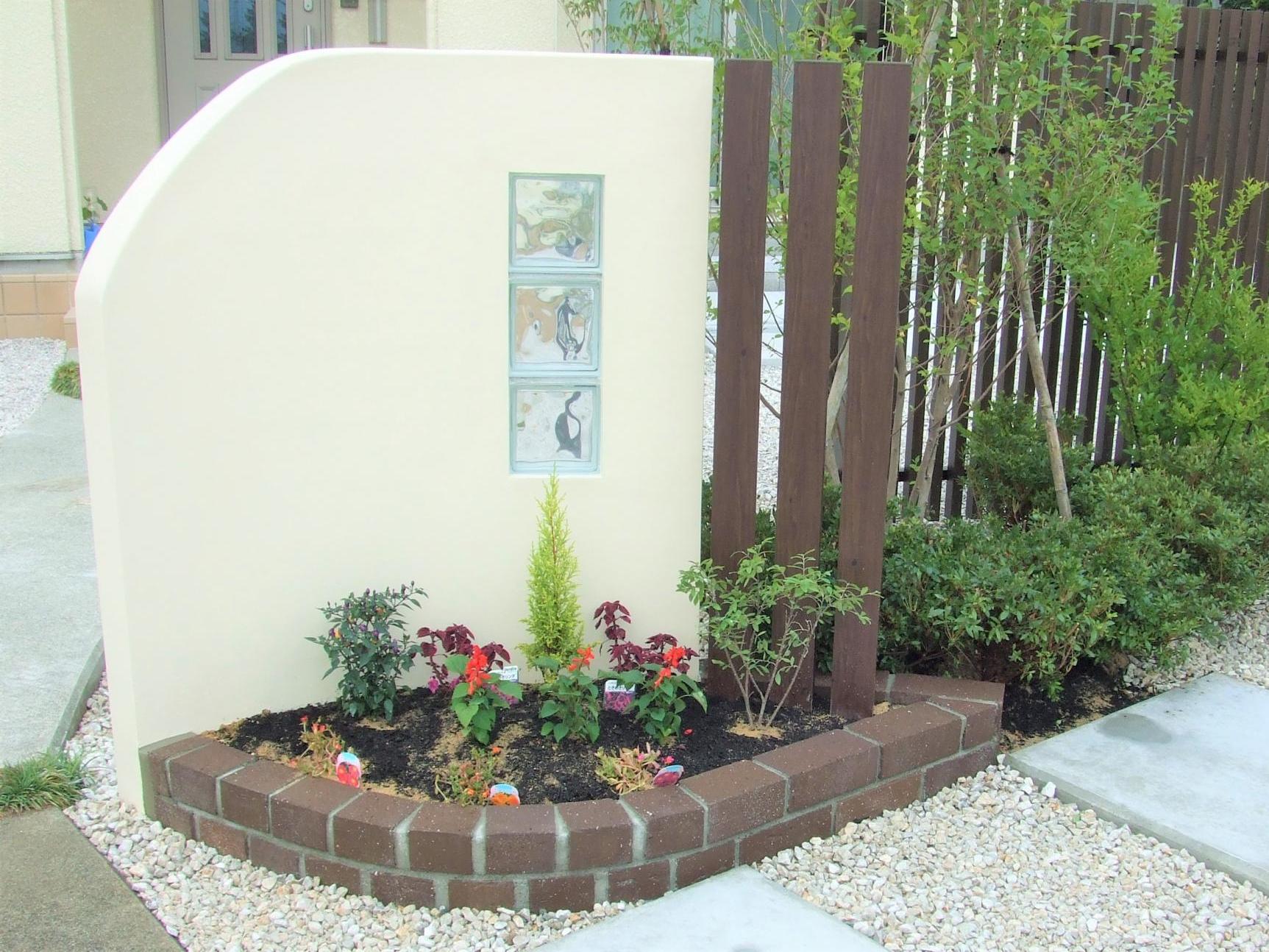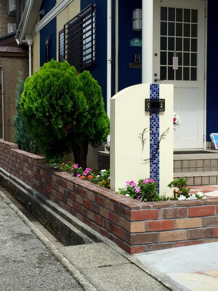門柱設置、花壇レンガ積み(2段)、目隠しフェンス、植栽植込み