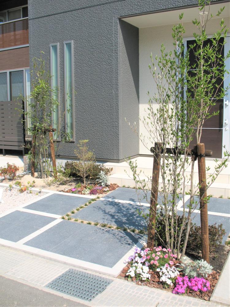 駐車場から建物までのスペースが広いため、見通しが良すぎたH様邸。植栽やフェンスで目隠しを設置しました。家族、来客から常に目に入るアプローチには門柱と花壇を。もともとあった既存樹を活かしながら新たに色鮮やかな植物を配置しました。プライバシーを守りながら美しい景観が完成しました。