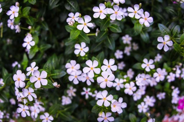 可憐な花がたくさん咲くことから、人気のニチニチソウ。ニチニチソウは開花が5月~10月と半年近くも咲き続ける上に、暑さや強い光にもとても強く、さほど手入れをしなくても咲いてくれます。カラーはピンク系濃淡、白、赤のほか、黒に近いシックな色と豊富。咲き方もカクタス咲きや小輪種などさまざまな形があります。
