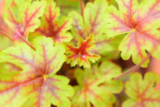 葉色のバラエティが豊富で人気のヒューケラ。ヒューケラは常緑性でほぼ一年中同じ草姿を保ち、ほとんど手がかからず日陰でもよく育ちます。葉色は緑葉のものから黄色や赤紫色の葉、そして斑入り葉など色や模様は変化に富みます。品種の特性をよく掴み、ヒューケラどうしをいろいろ組み合わせて植えてみてはいかがでしょうか。