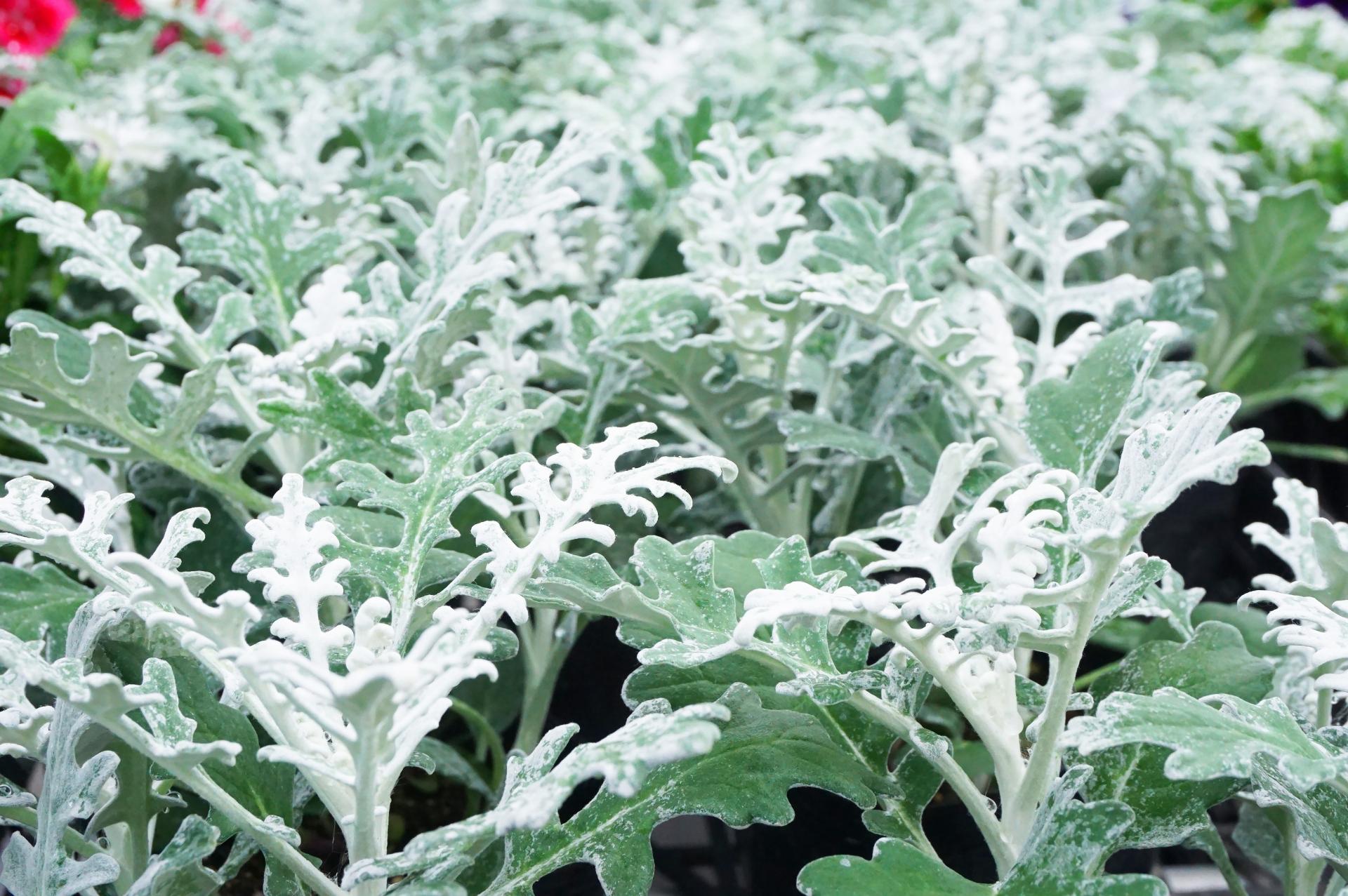 葉色の美しさで人気のシロタエギク。シロタエギクは、寒さに強く霜に当たっても枯れないことから、冬の花壇に欠かせない植物です。高温多湿には株元が蒸れやすいので、水はけと風通しがよい場所で栽培するとよいでしょう。株全体がシルバーに見えることから、花壇や寄せ植えのアクセント素材に多く利用されています。