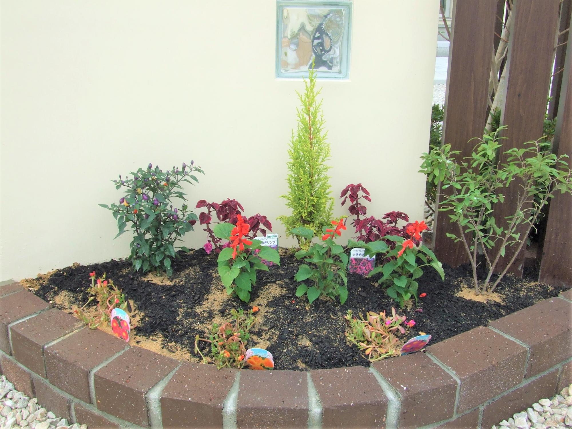 低木:コニファー、クチナシ、ユリウス、ポーチュラカ、サルビア、トロピカルキャンドル(唐辛子)