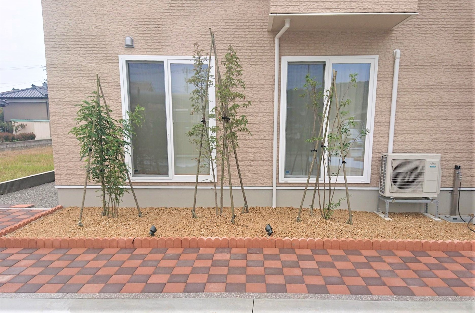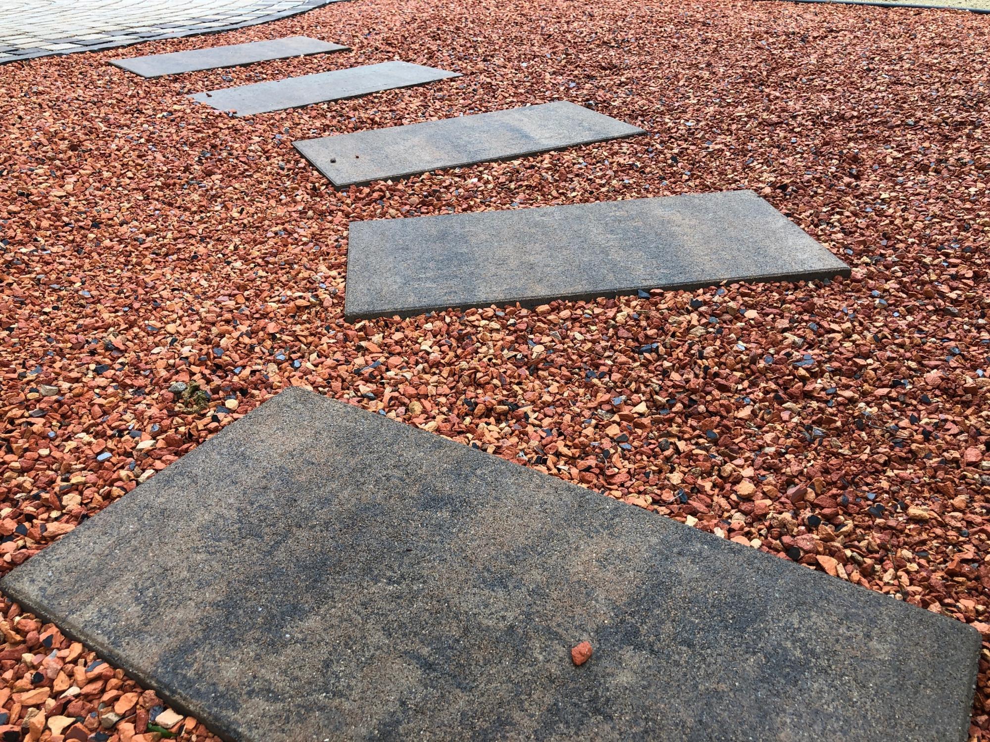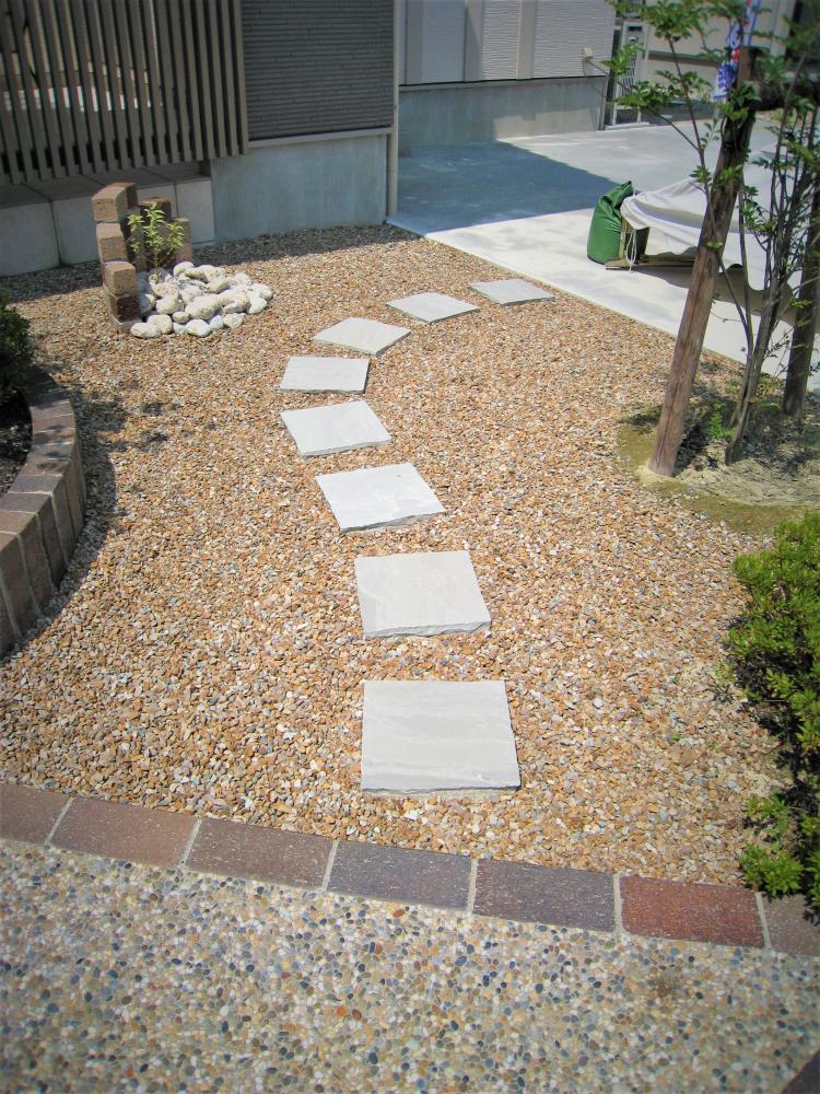 こちらはキャラメルストーンの砂利を園路に用いた施工例です。足もとは白のコンクリートタイルを飛び石風に設置。キャラメルストーンの砂利は白系の素材との組み合わせるとコントラストが楽しめます。