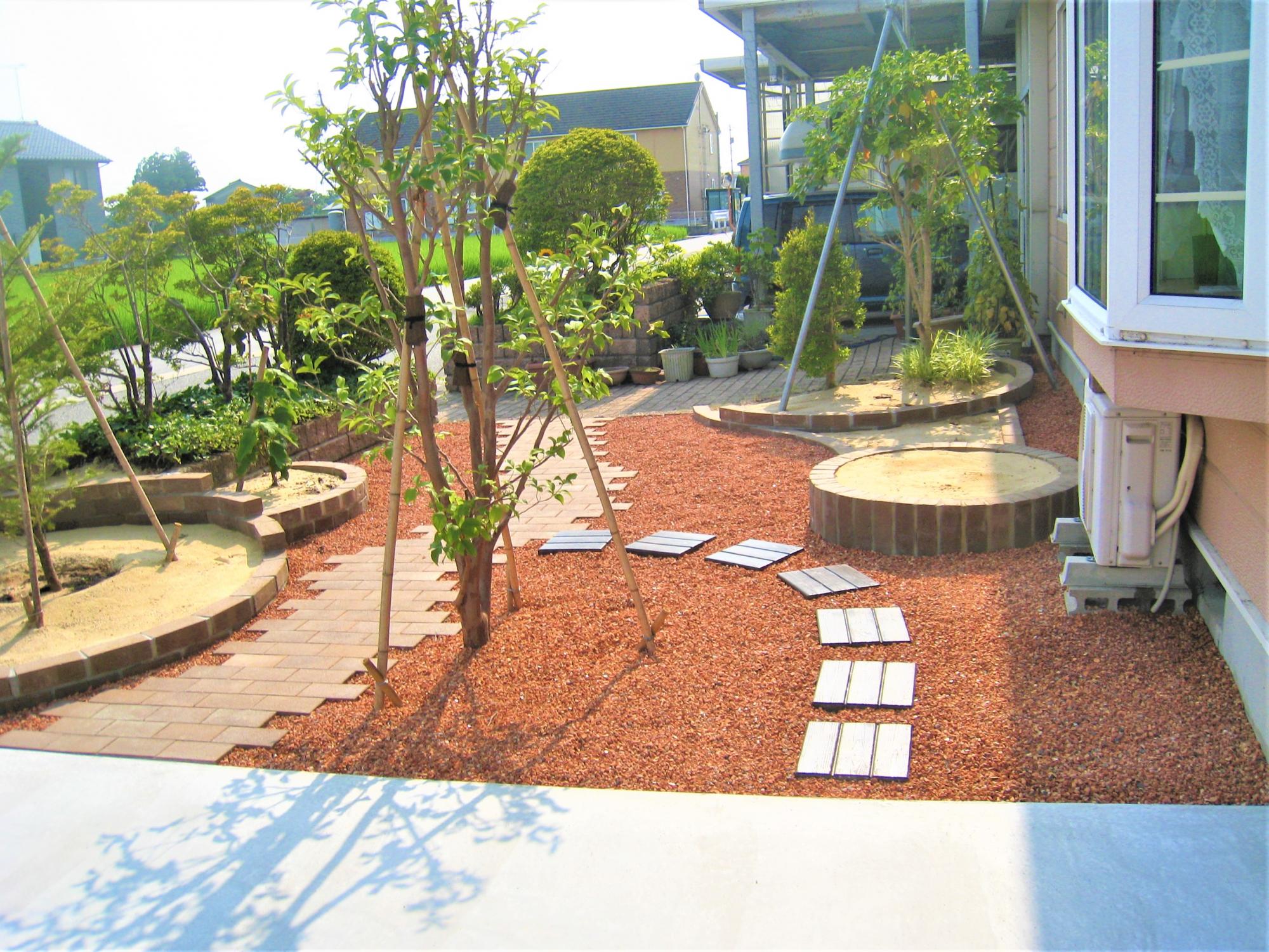 瓦チップは茶系の庭に人気のある素材です。瓦を砕いたリサイクル素材のため、針金など混入物がある場合もあるのが懸念点です。さらに粒が小さいため、雨風で飛んでいくこともあります。小さなお子さんが遊ばない場所での使用や花壇での利用をオススメしています。