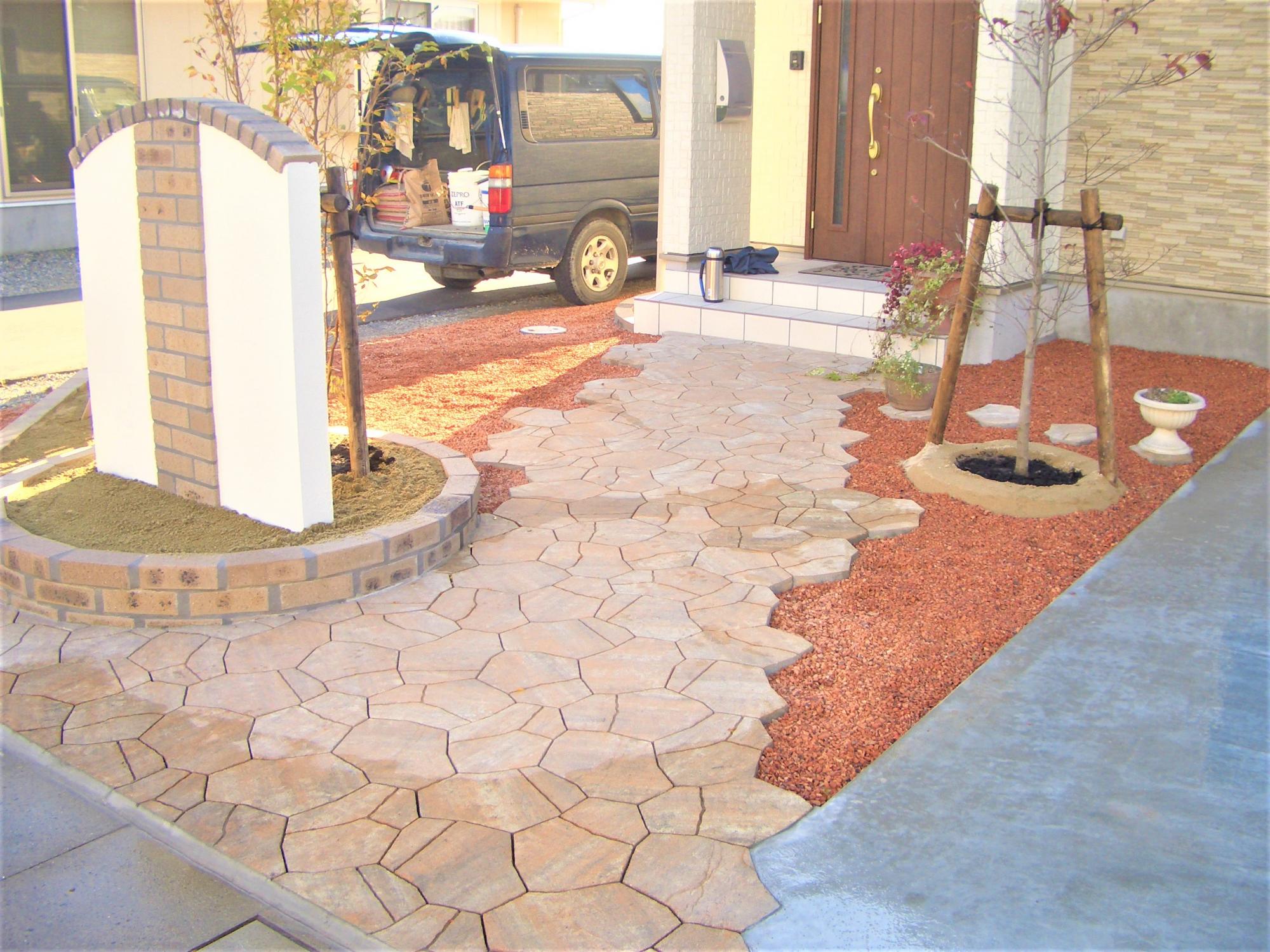 こちらは瓦チップを南欧風の庭に用いた施工例です。瓦チップの色味が温かみのある玄関周りを演出してくれます。瓦チップはレンガや茶系のタイルと好相性です。