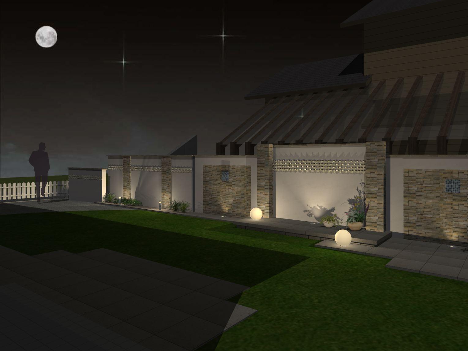 グランドライト、ボールスタンドライト、スポットライトウォールライトのガーデンライトを組み合わせたお庭。背の高い塗壁で外部からの視線を遮りながら、閉鎖的な印象にならないよう段差をつけ、高さを調整。壁を照らすことで明るさだけでなく、高級感も演出されます。全体的に上品で落ち着いた雰囲気に仕上げました。