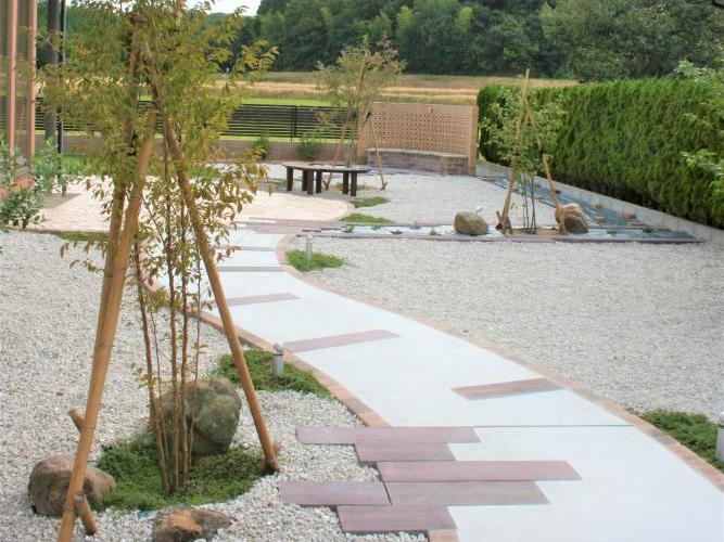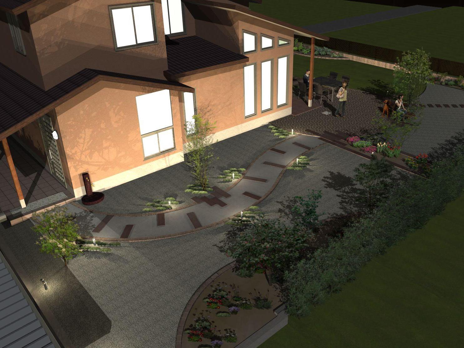 アプローチ工事、スタンプコンクリート、ライティング、植栽工事、砂利敷き、ベンチなど