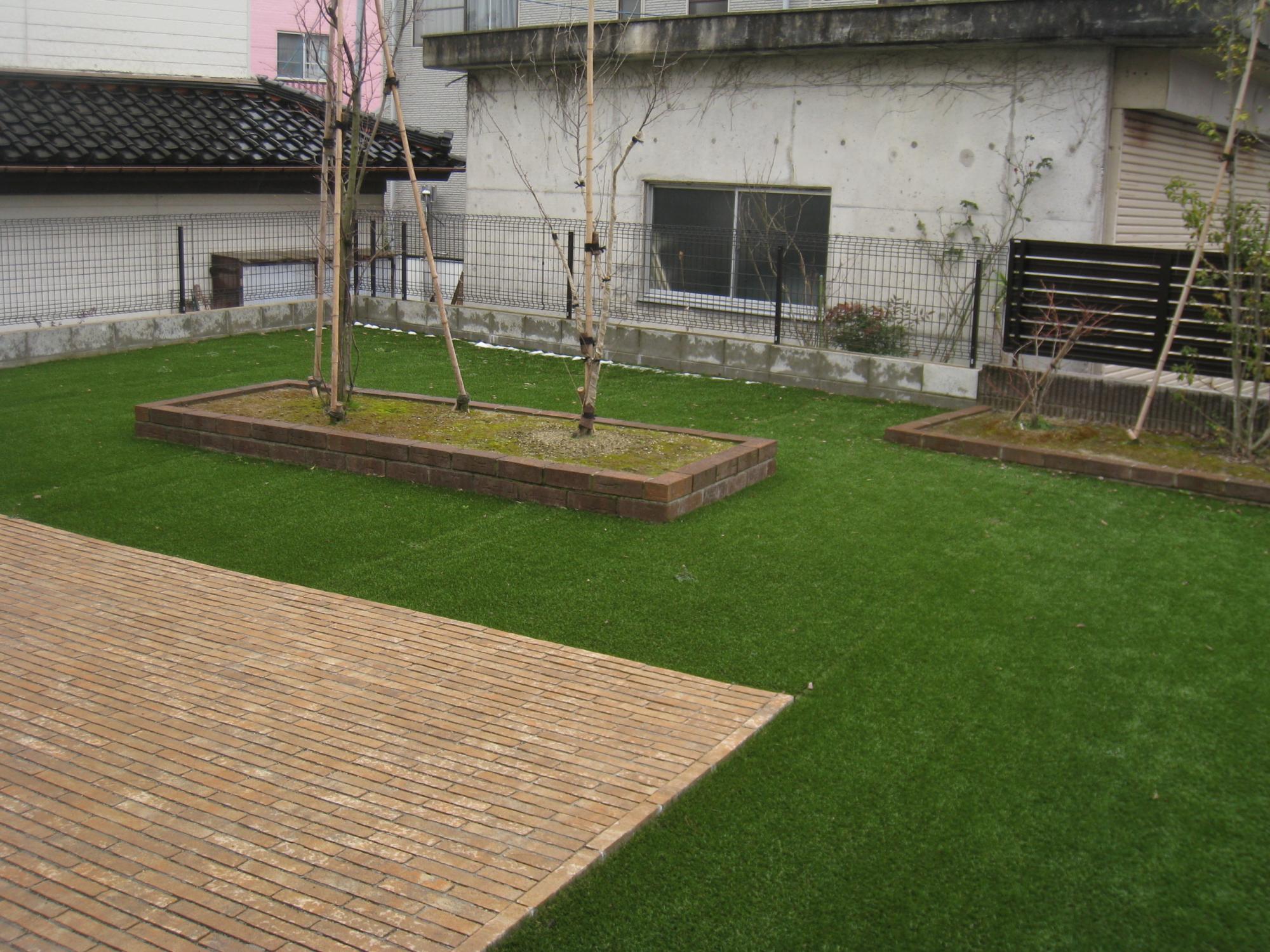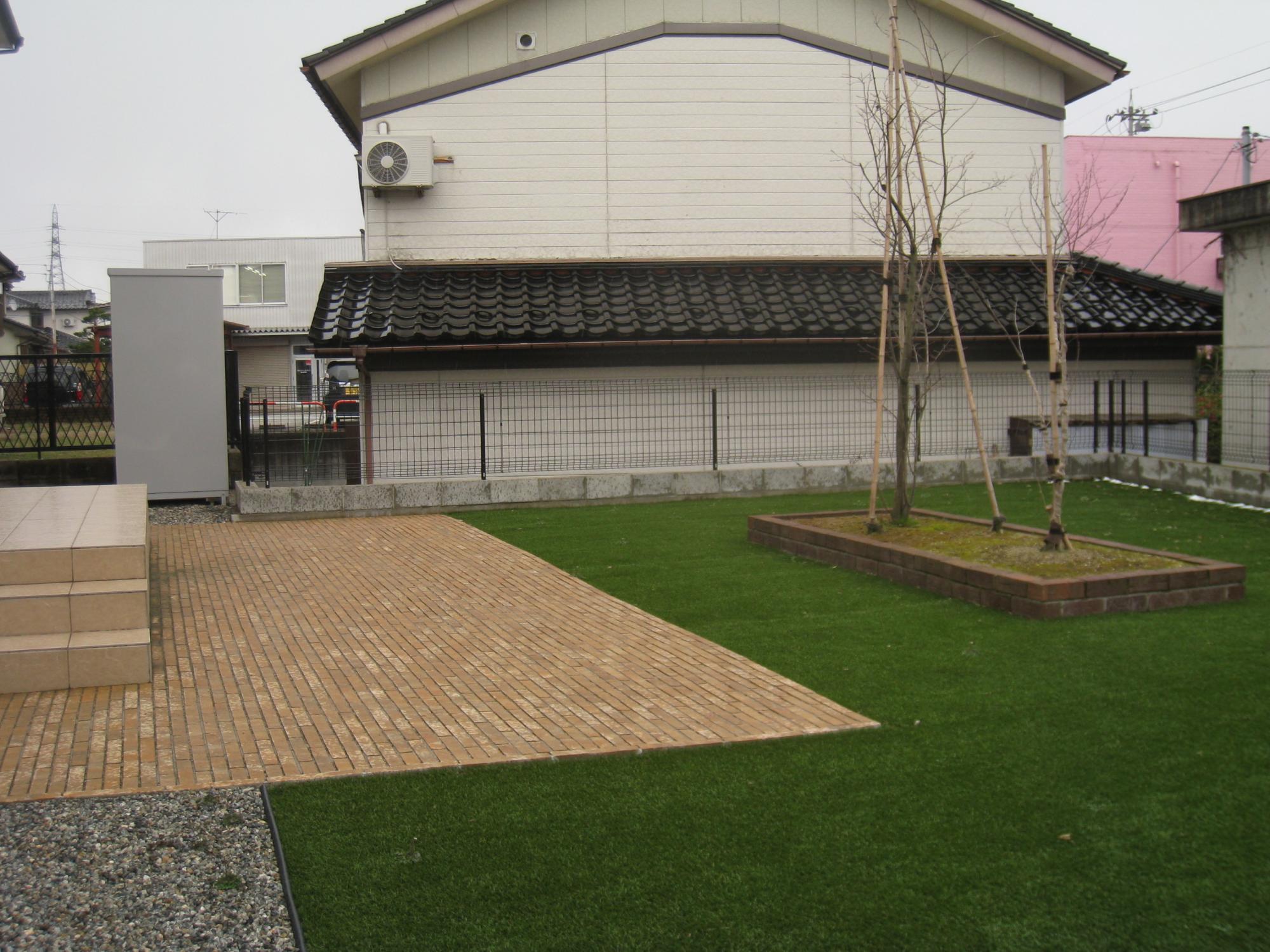 タイルテラス、舗装材敷、人工芝張り、砂利敷、花壇、植栽工事
