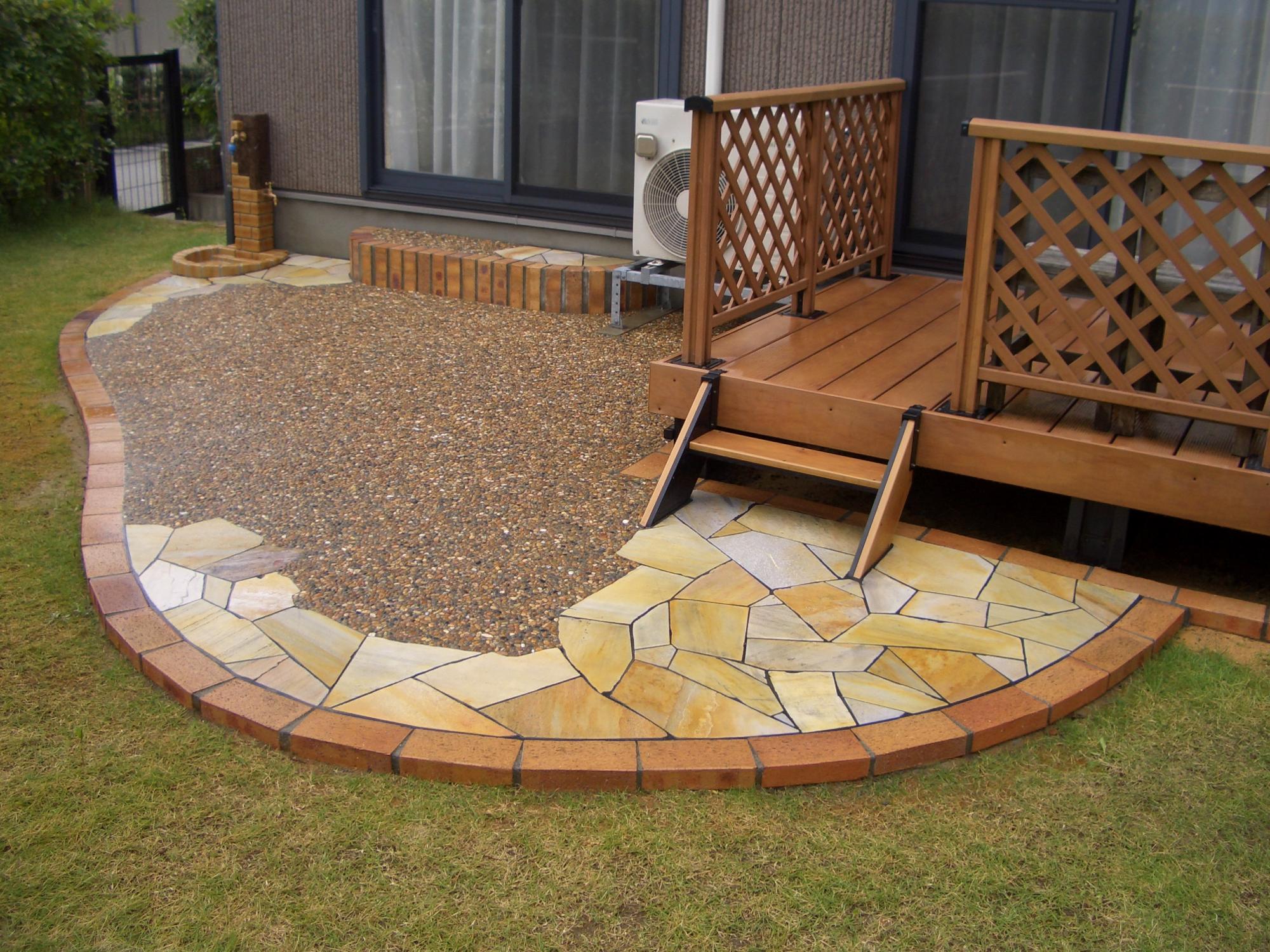 ウッドデッキステップ追加、植栽工事、舗装材敷き、砂利敷き