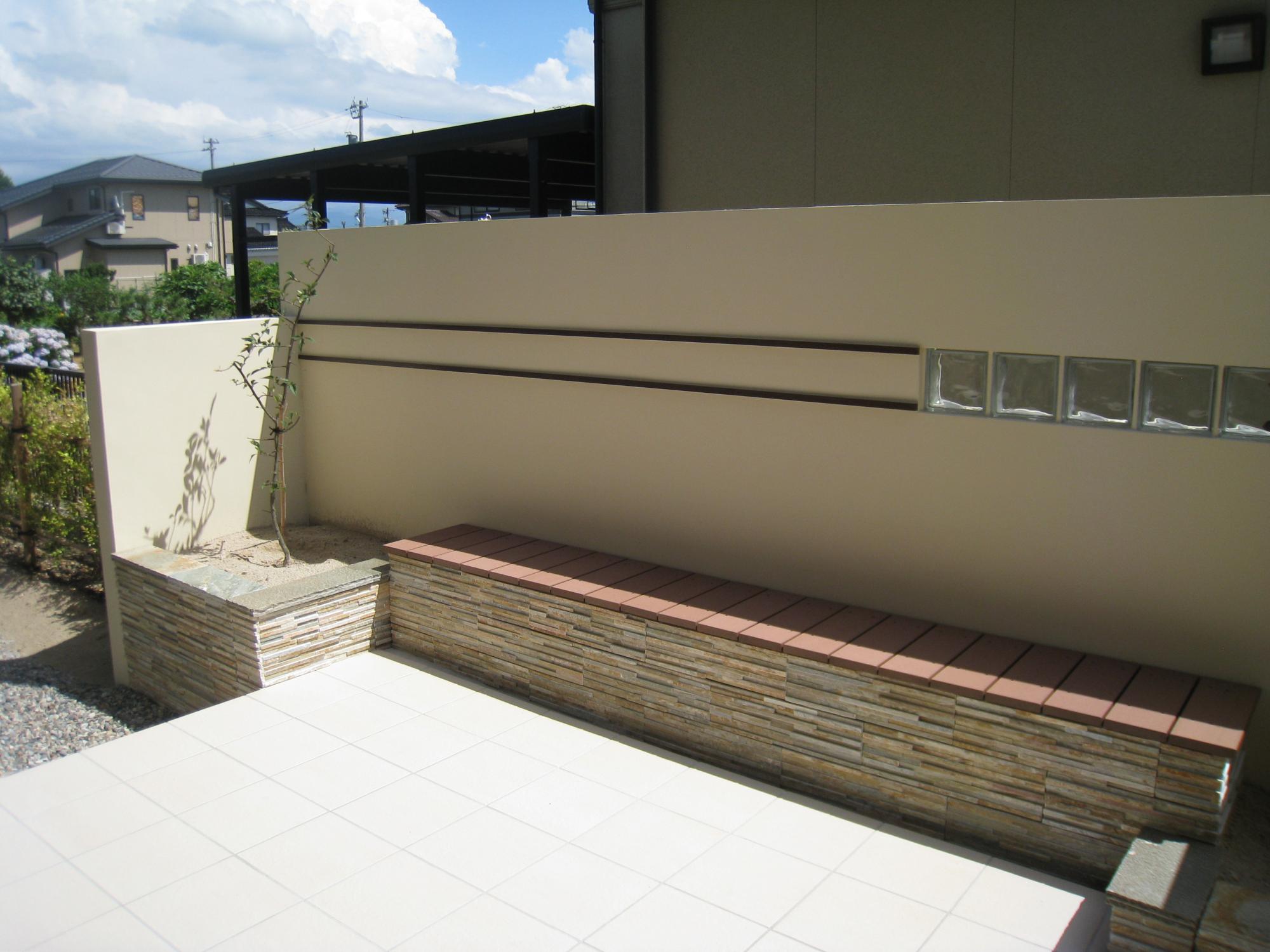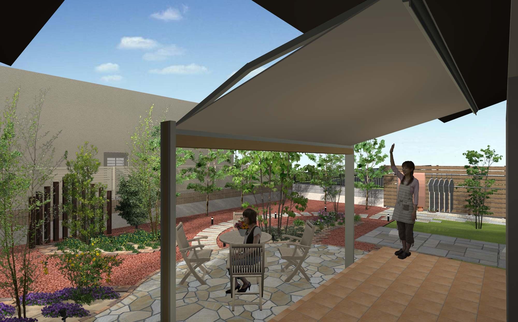 タイルテラス、シェード、ベンチ、境界塀、植栽