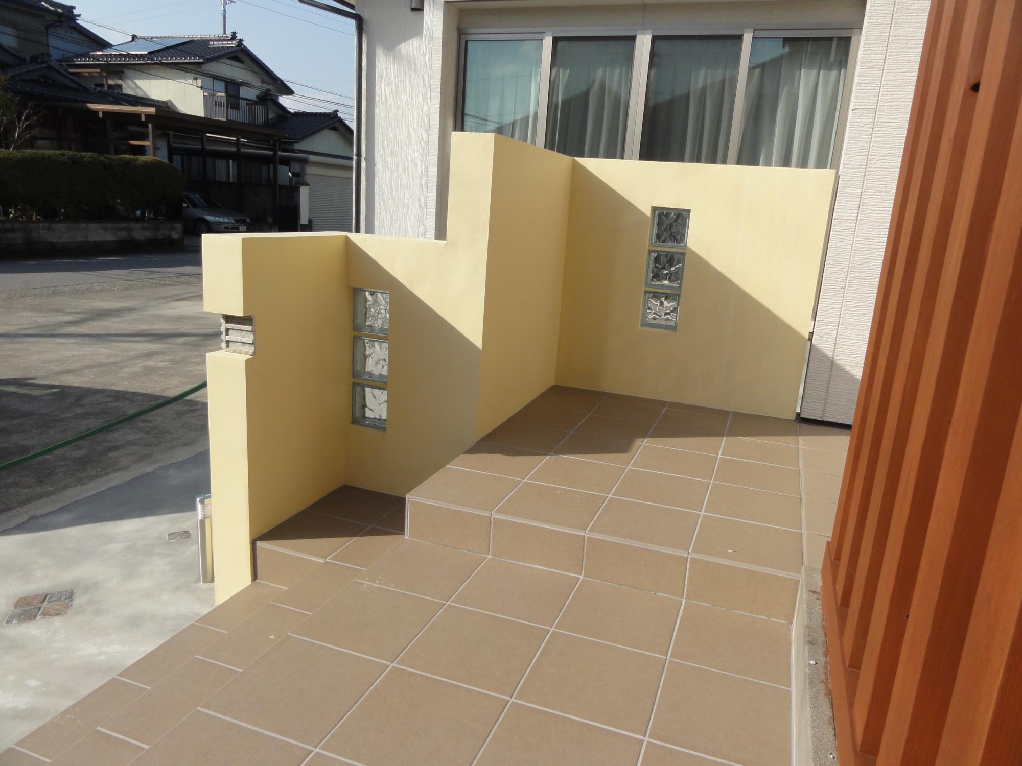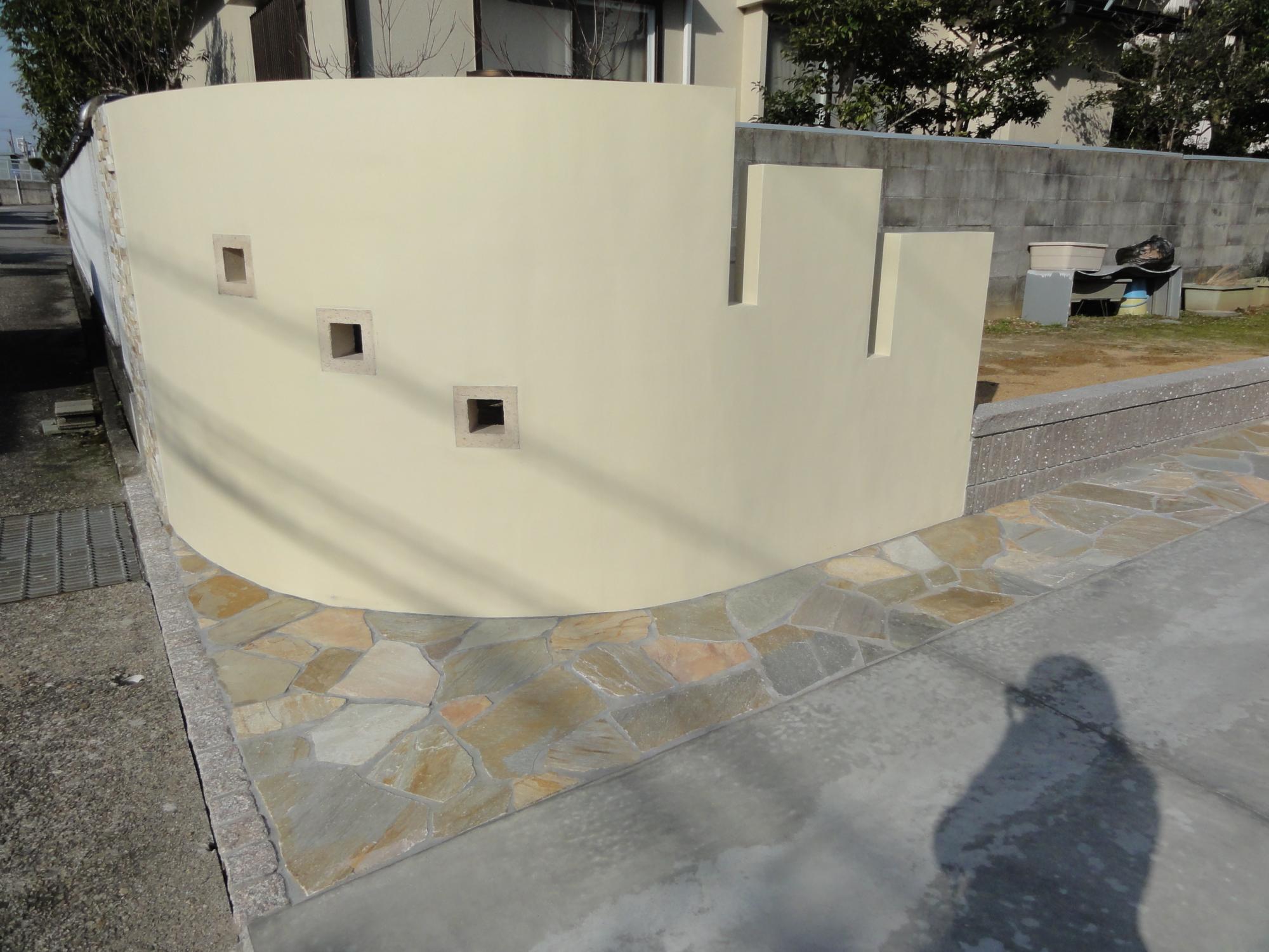 南欧風にエクステリアをリフォームしました。アプローチは自然石の美しさが華やかに彩るよう乱張りに。門袖の丸みのある壁、小さい窓は南欧風の特徴になります。明るい印象を受けるファサードが完成しました。