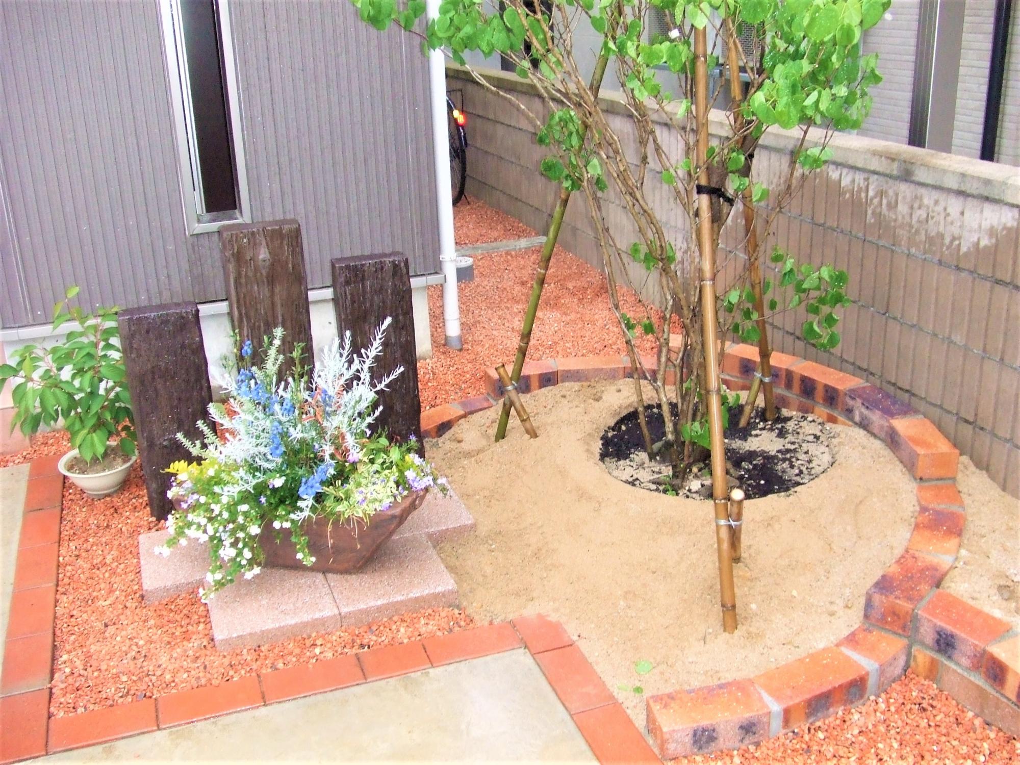 樹木は管理しやすい常緑樹シマトネリコやオリーブなどがよく使われます。根元のグランドカバーには瓦チップやウッドチップを選ぶことで温かみを演出できます。樹木を植える場所は小さいお子さんがおられるときは砂場に。お子さんが大きくなったら、花壇やシンボルツリーを植える場所にしてもオススメです。