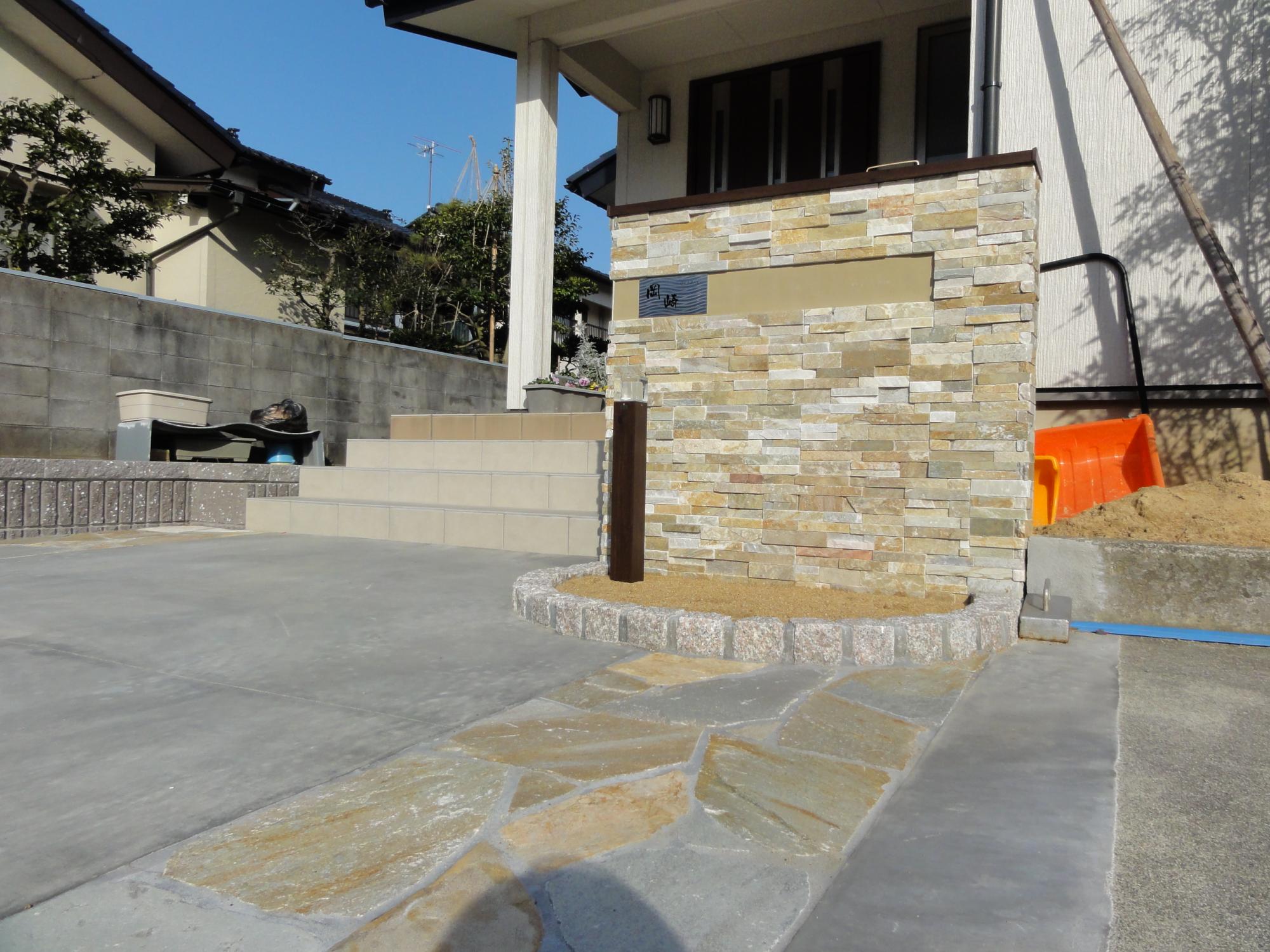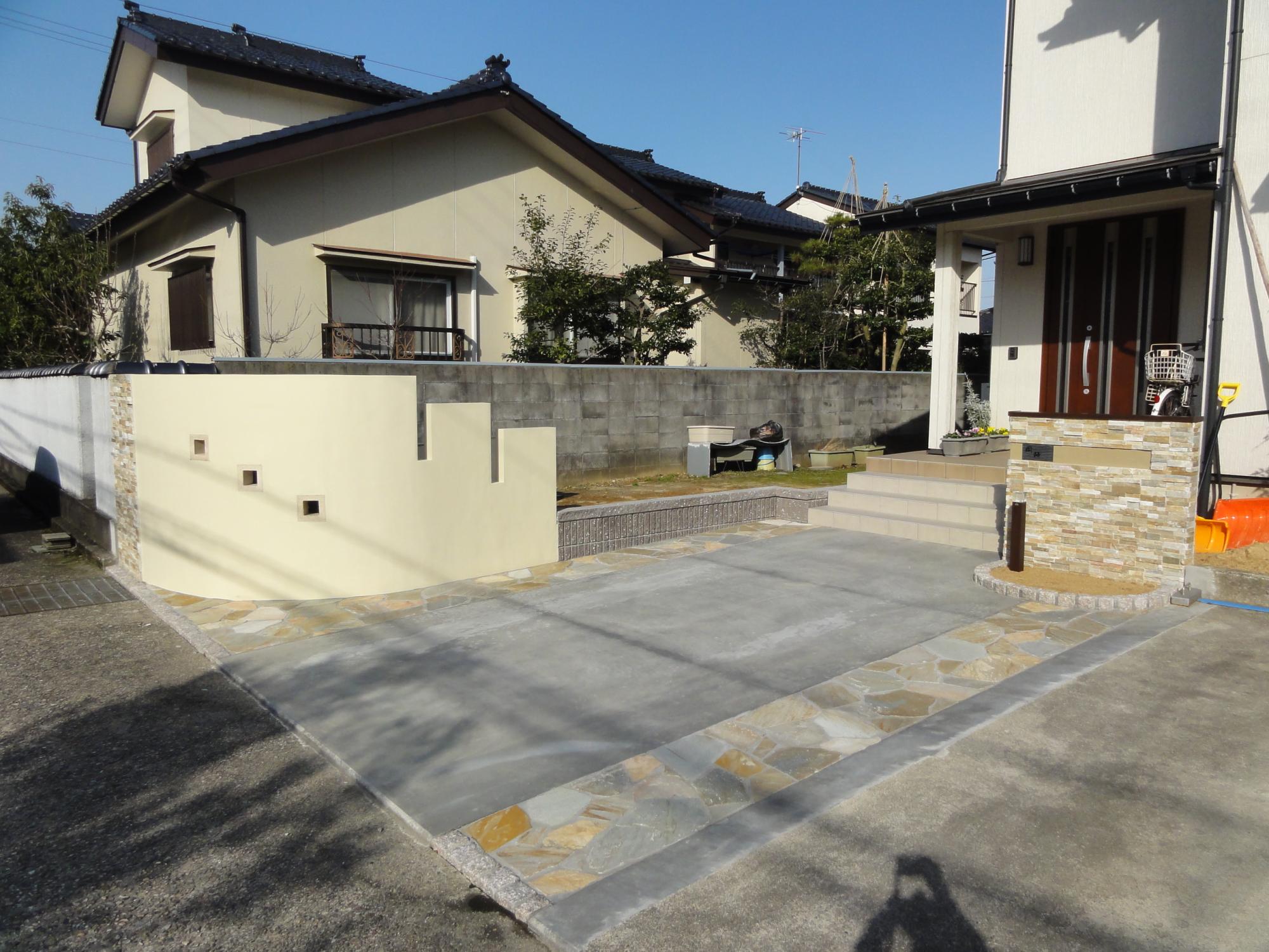 門柱、門袖、アプローチ兼駐車スペース、土留め用化粧ブロック積み、照明、花壇