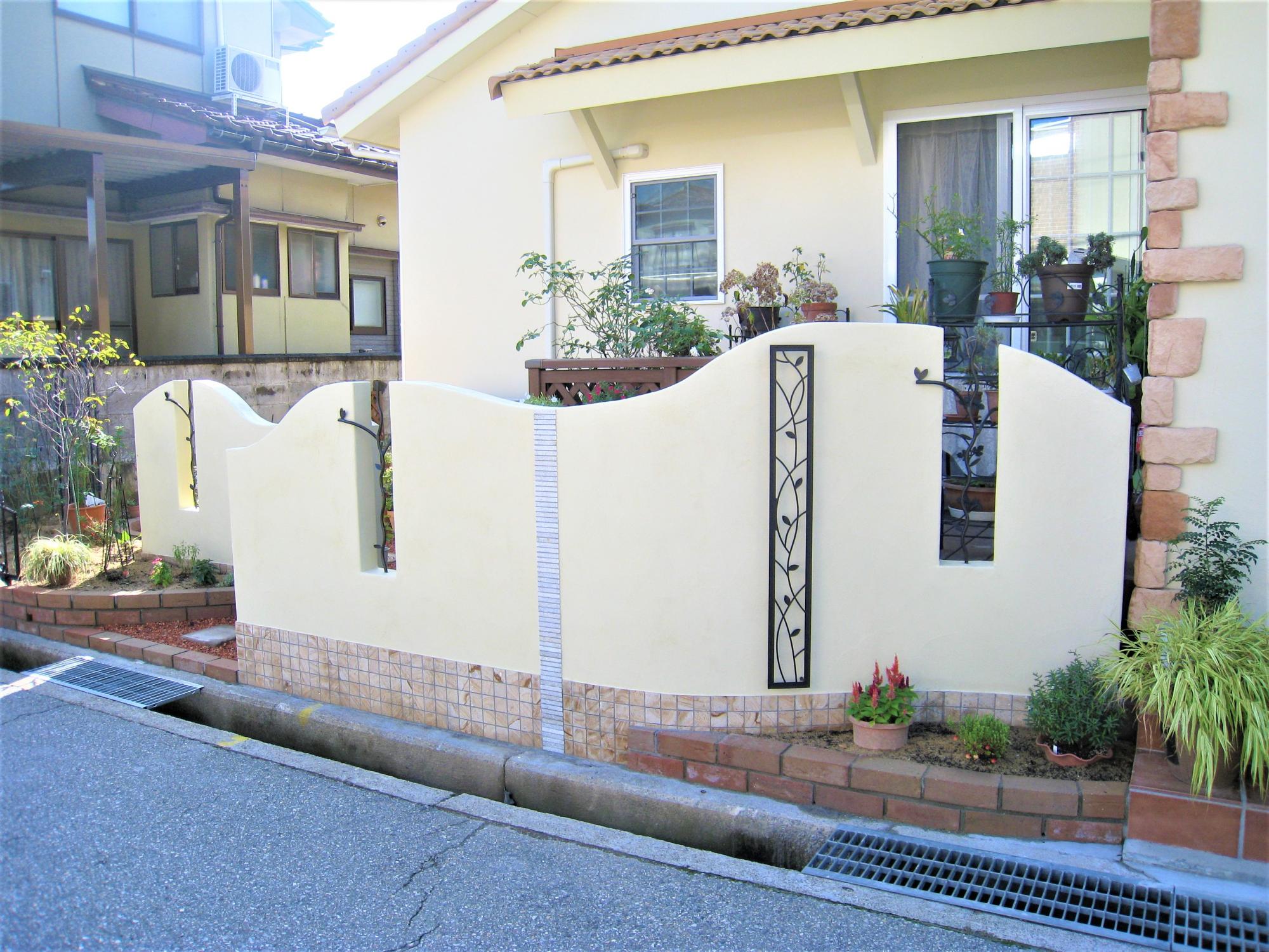 南欧風にエクステリアをリフォームしました。アプローチ、門柱は丸みを持たせ、足元には植栽を配置。表札はアイアンを施しました。明るく華やかな玄関周りになりました。