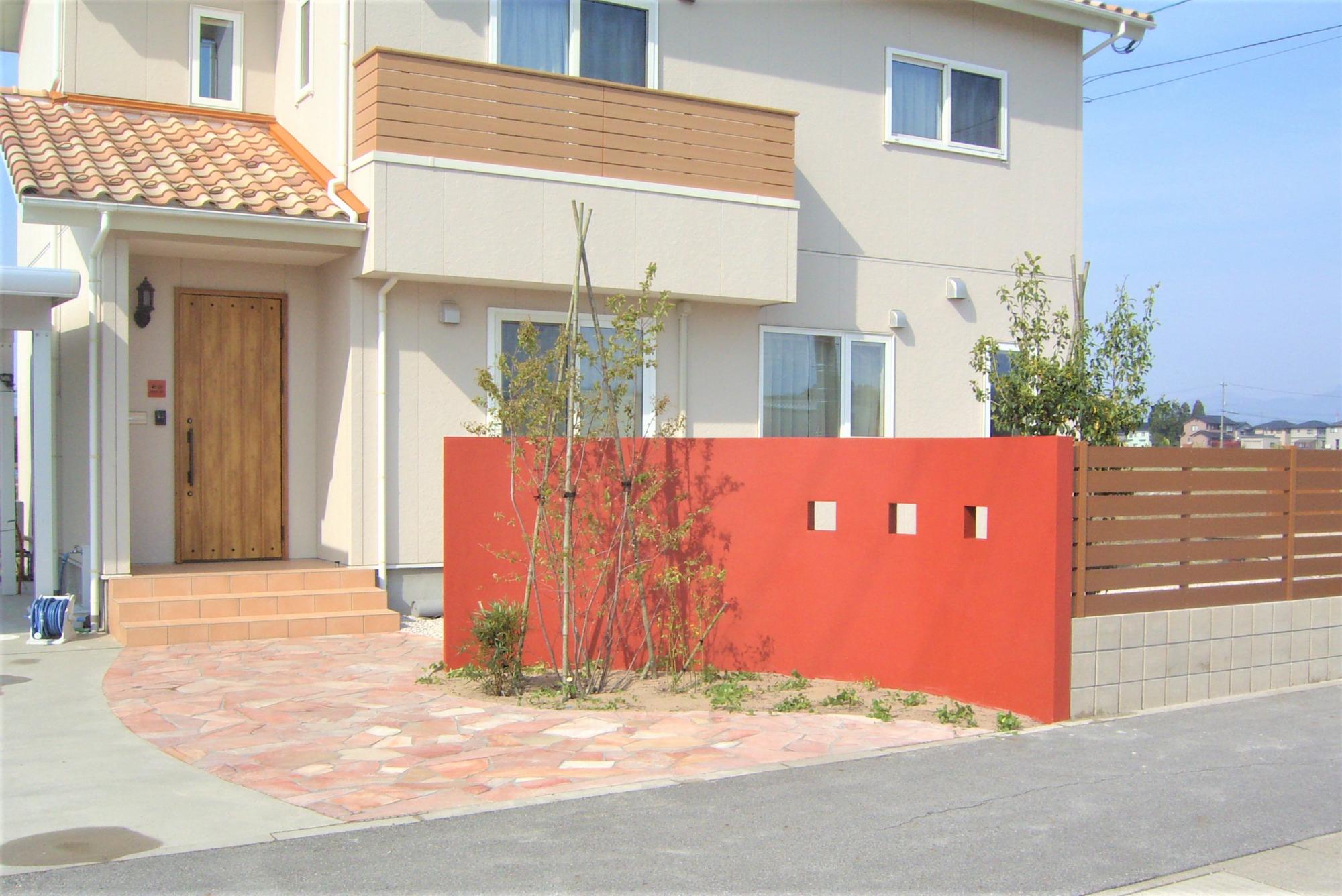 南欧風のエクステリアにするポイントは、ベースカラーに暖色系を入れ、レンガや石などのアイテムを動きのあるデザインに落とし込むことです。
