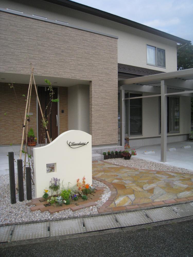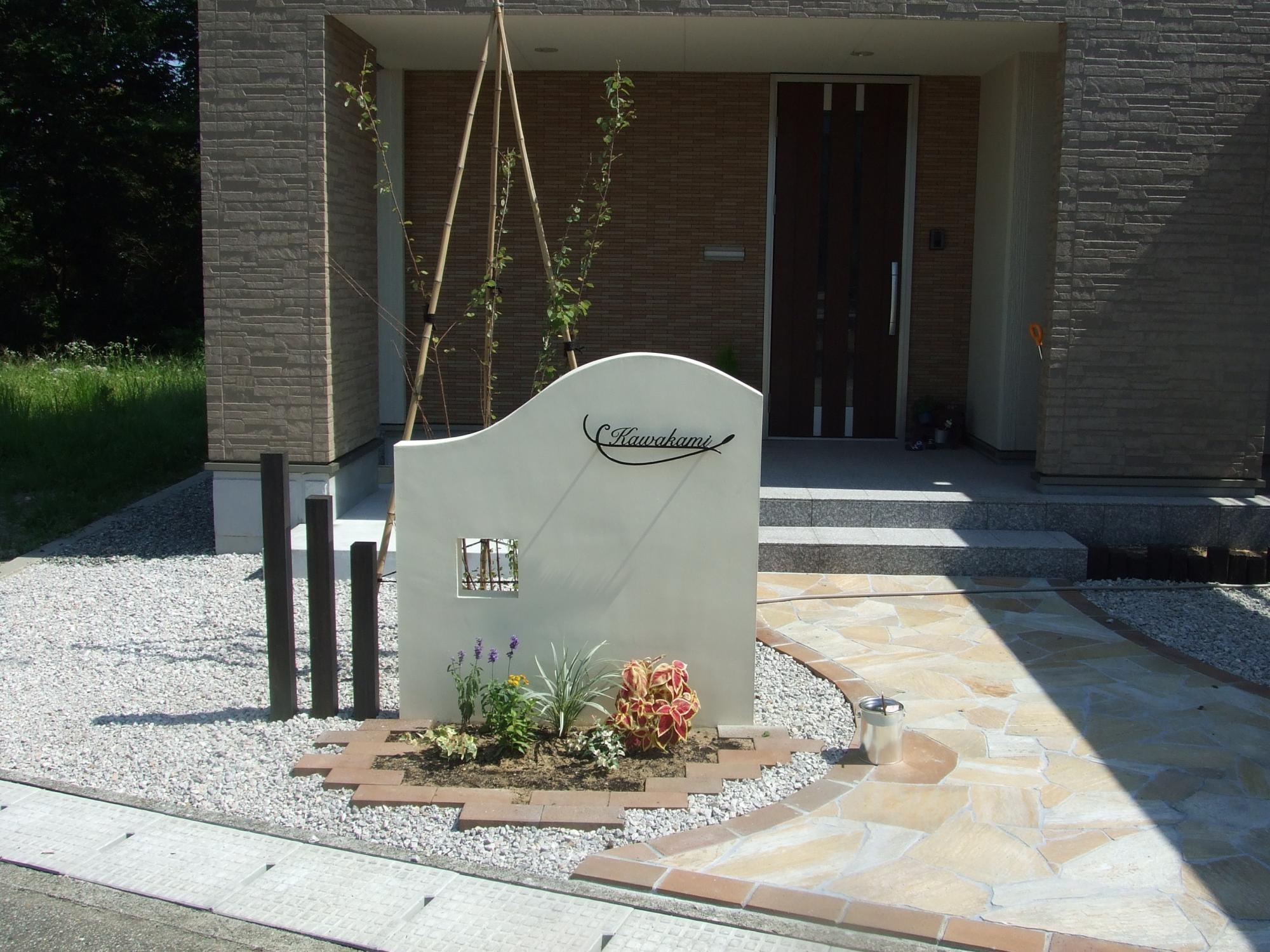 アプローチ、門柱、花壇、植栽、砂利敷き