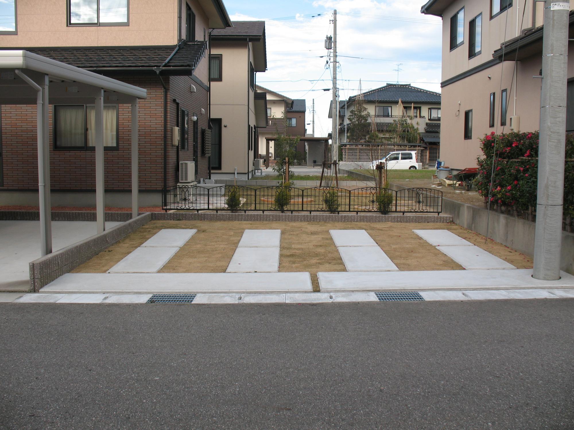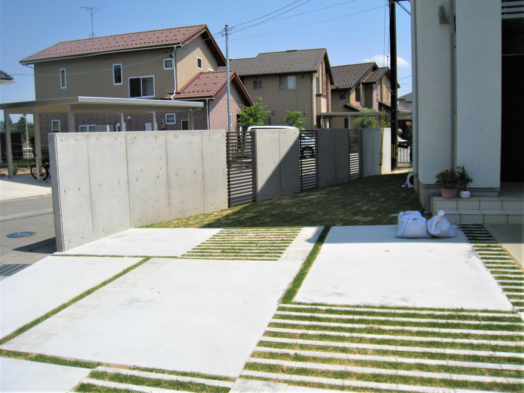 こちらはタイヤが乗る部分のみコンクリートにした駐車場の実例。飽きのこないシンプルな駐車場は、住宅が引立ちます