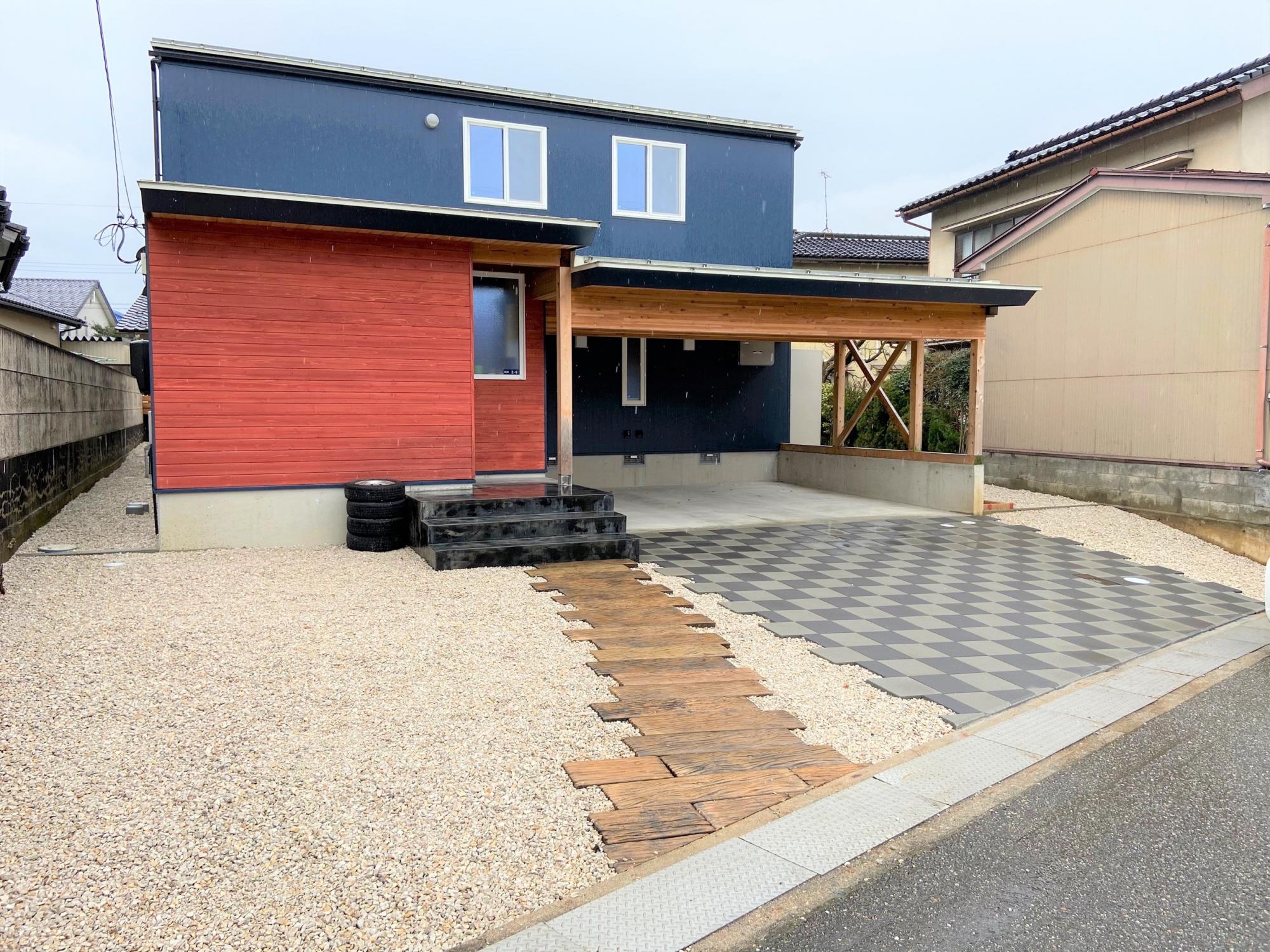枕木との組み合わせも、パッと目を引く駐車場に。 ウッドテイストな家の外観と枕木とがマッチし、ナチュラルな印象に仕上がっています。