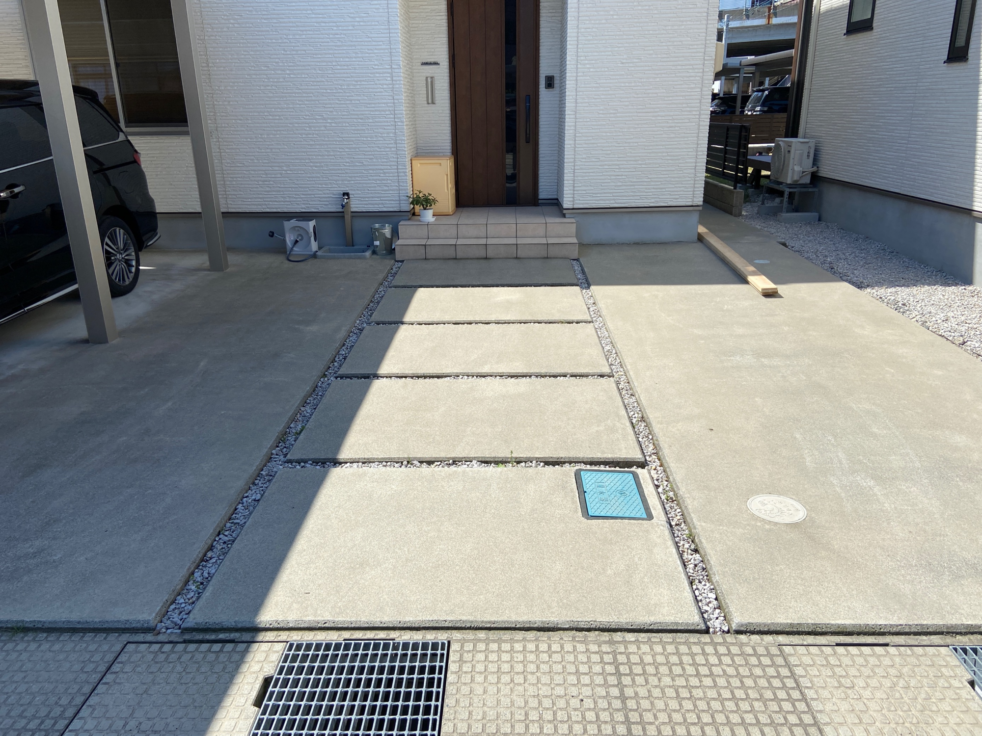 こちらはコンクリートとタイルを組み合わせた駐車場の例。コンクリートの無機質な印象が緩和され、タイルで温かみを出しています