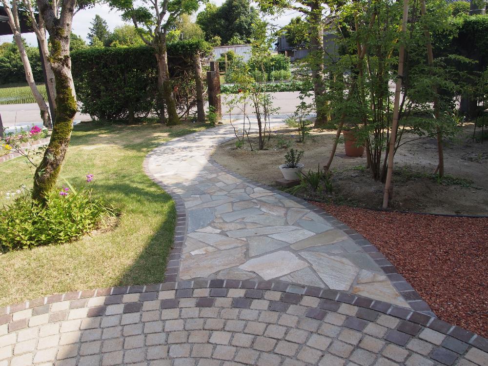 プロの手により、異素材同士が上手く混ざり合い、とてもオシャレで優雅な雰囲気を演出しています。アプローチを曲線にすることで空間の奥行きも感じます。