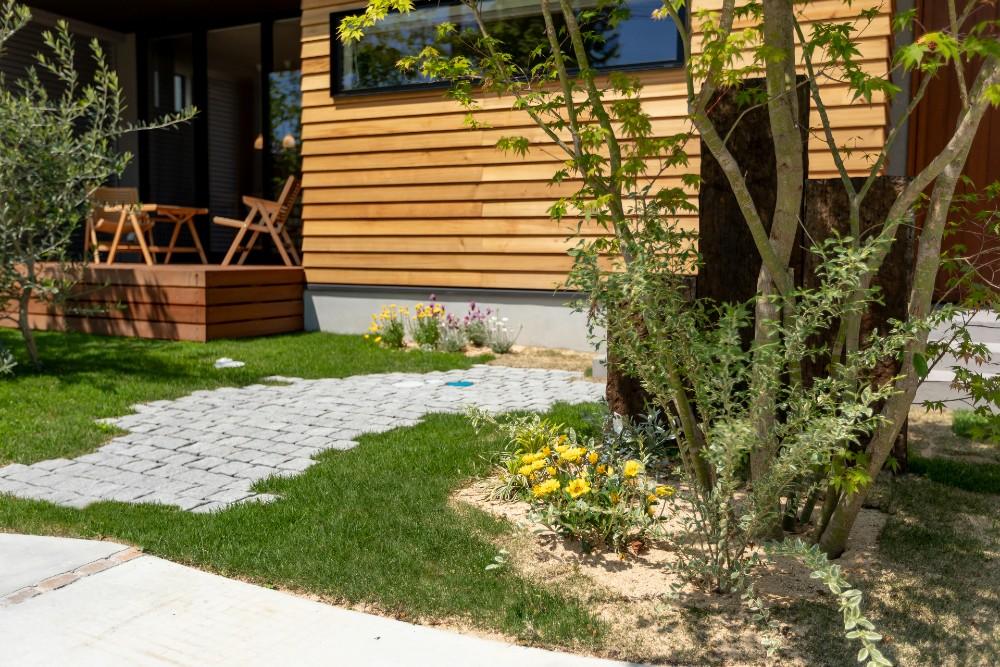 植栽のグリーンや住宅の外観の木材との相性も良く、デザイン性の高い玄関アプローチになっています。