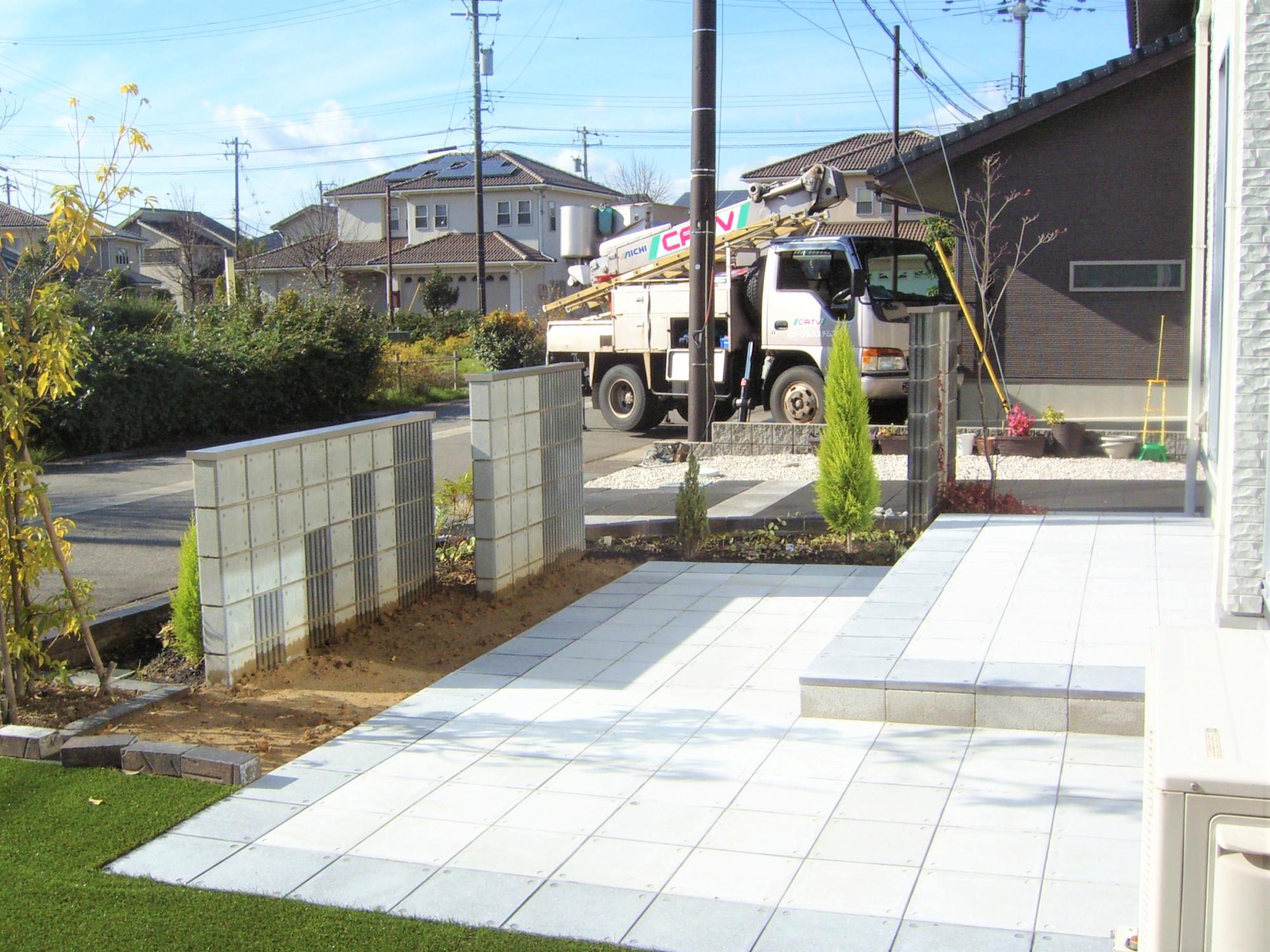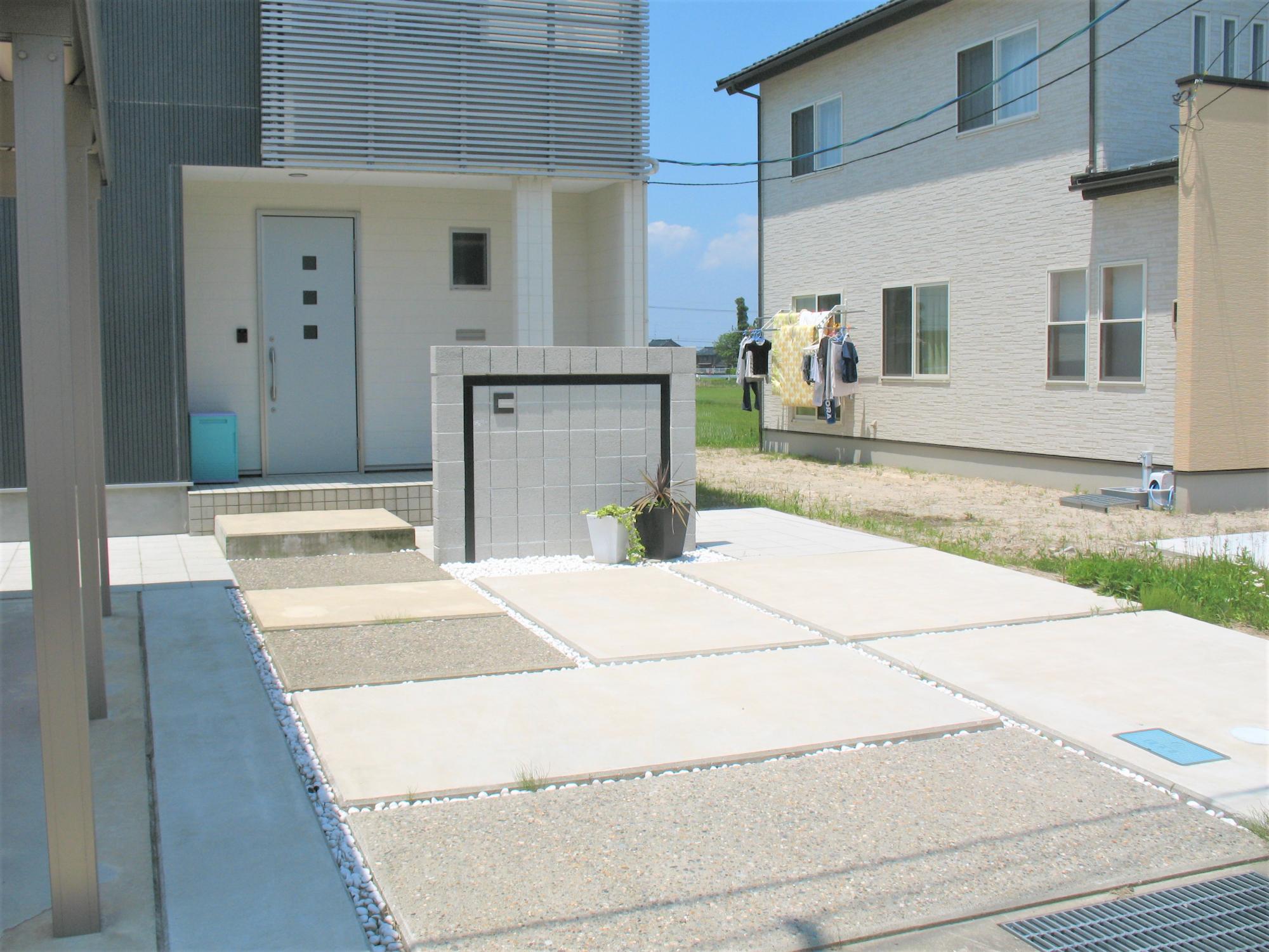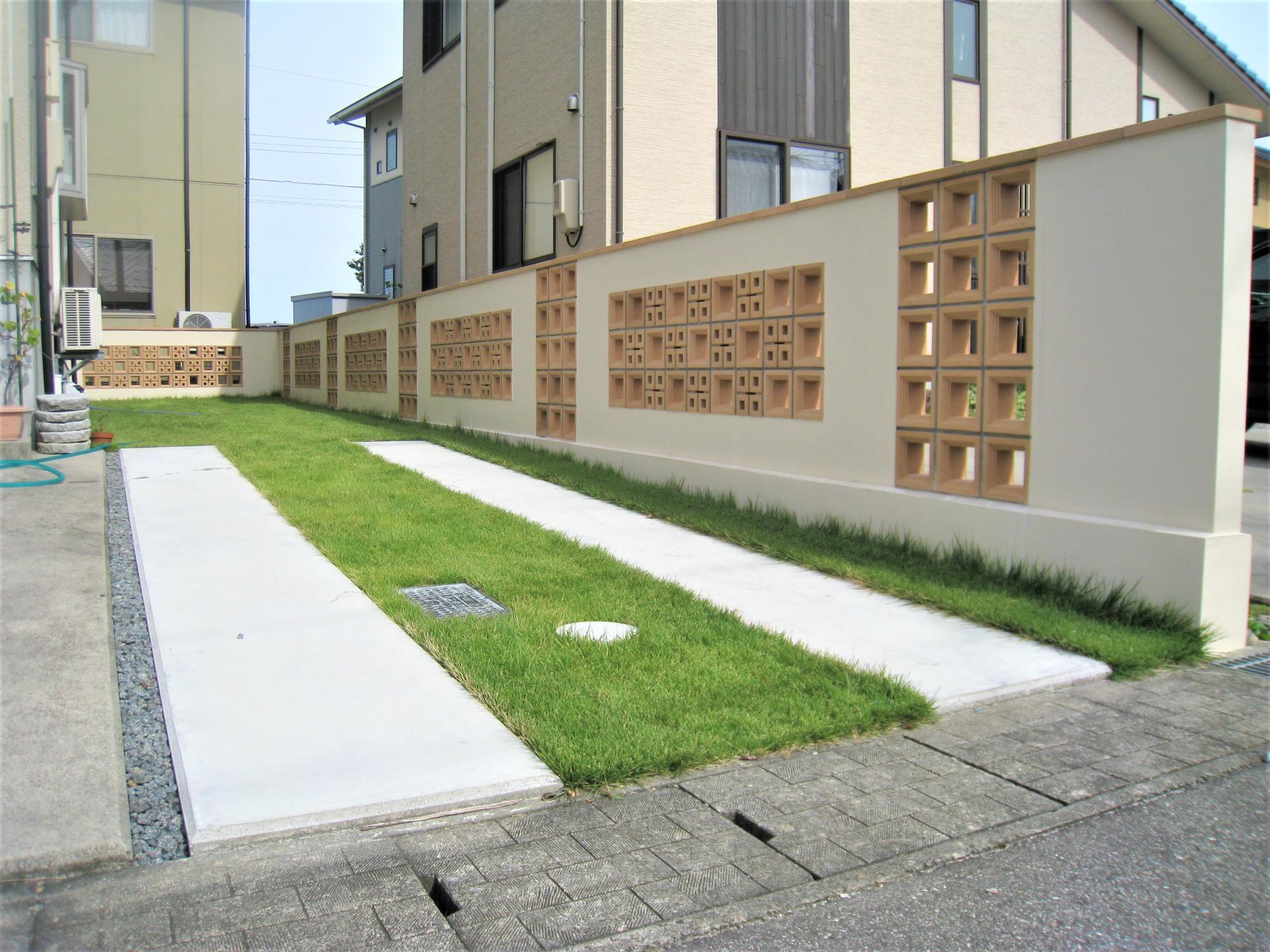 芝生がある玄関口をご希望されていたので、芝生を植え、境界にはブロックを積み、部分的に穴が開いたスクリーンブロックを採用しました。閉鎖的にならないようなデザインとメンテナンスが行き届いた緑色の芝生は、庭に明るくさわやかな印象をあたえてくれます。また、芝生の中でも車が駐車できるように、車のタイヤが通る部分のみ土間コンクリ―トを打ち、見た目の美しさだけでなく、利便性も高めました。