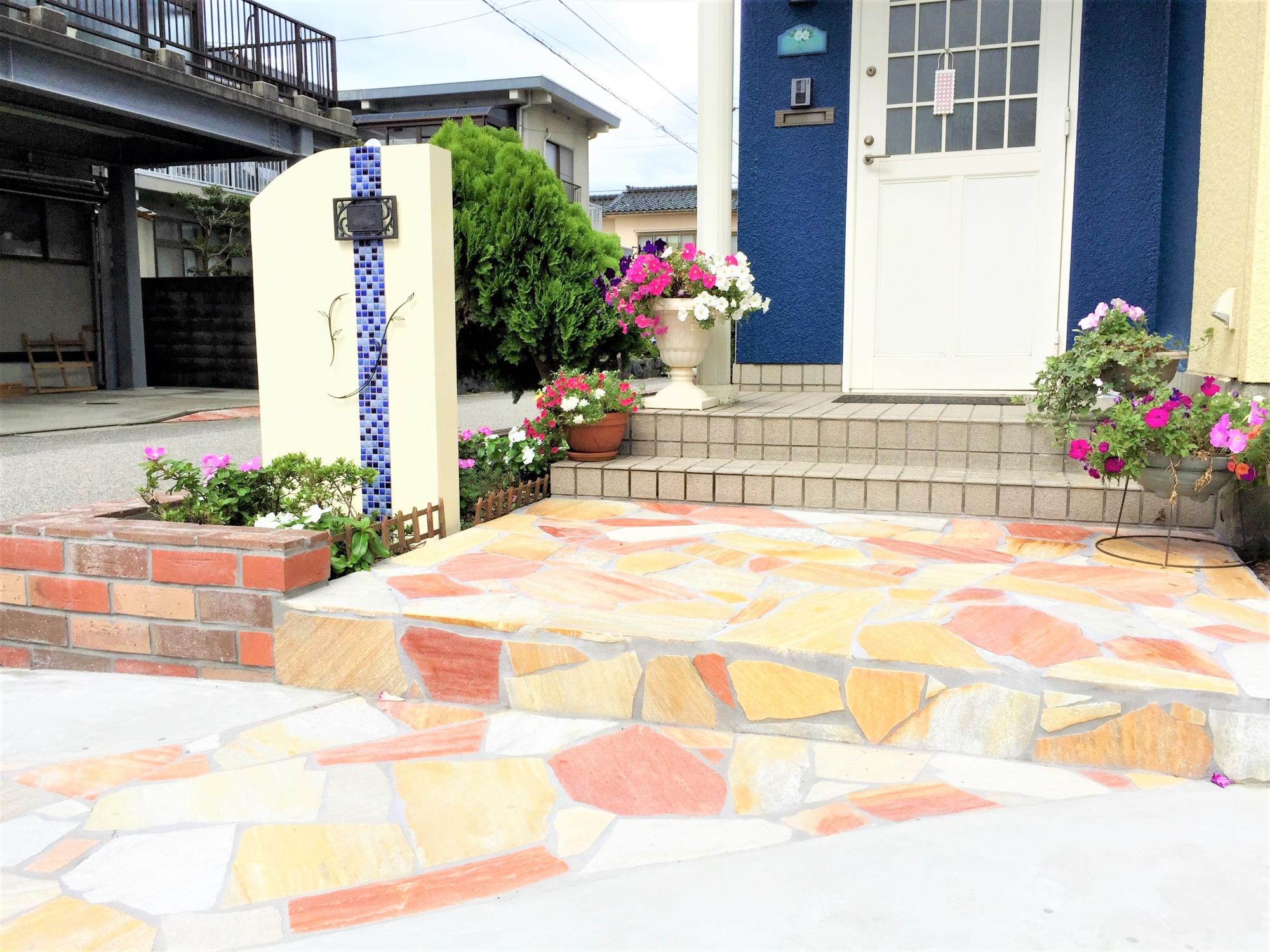 玄関と道路の間にはある程度の解放感があるセミクローズを設置。緩やかなカーブの塀にはお家の雰囲気に合わせて、モザイクタイルと鋳物の飾りを施しました。また、レンガ花壇には多年草やハーブやラベンダーなど、育てやすくて色鮮やかな植物を植え、可愛らしさも演出しています。