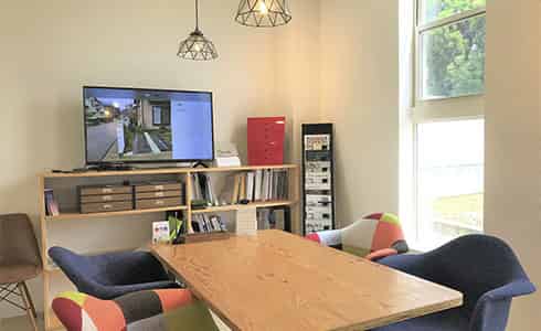 打ち合わせエリアでは大きなモニターを使用し、庭の使い方やレイアウト、デザインなどのイメージする空間やデザインを体感できます。納得感を持って、限られた空間を有効的に使えるお庭をご提案をします