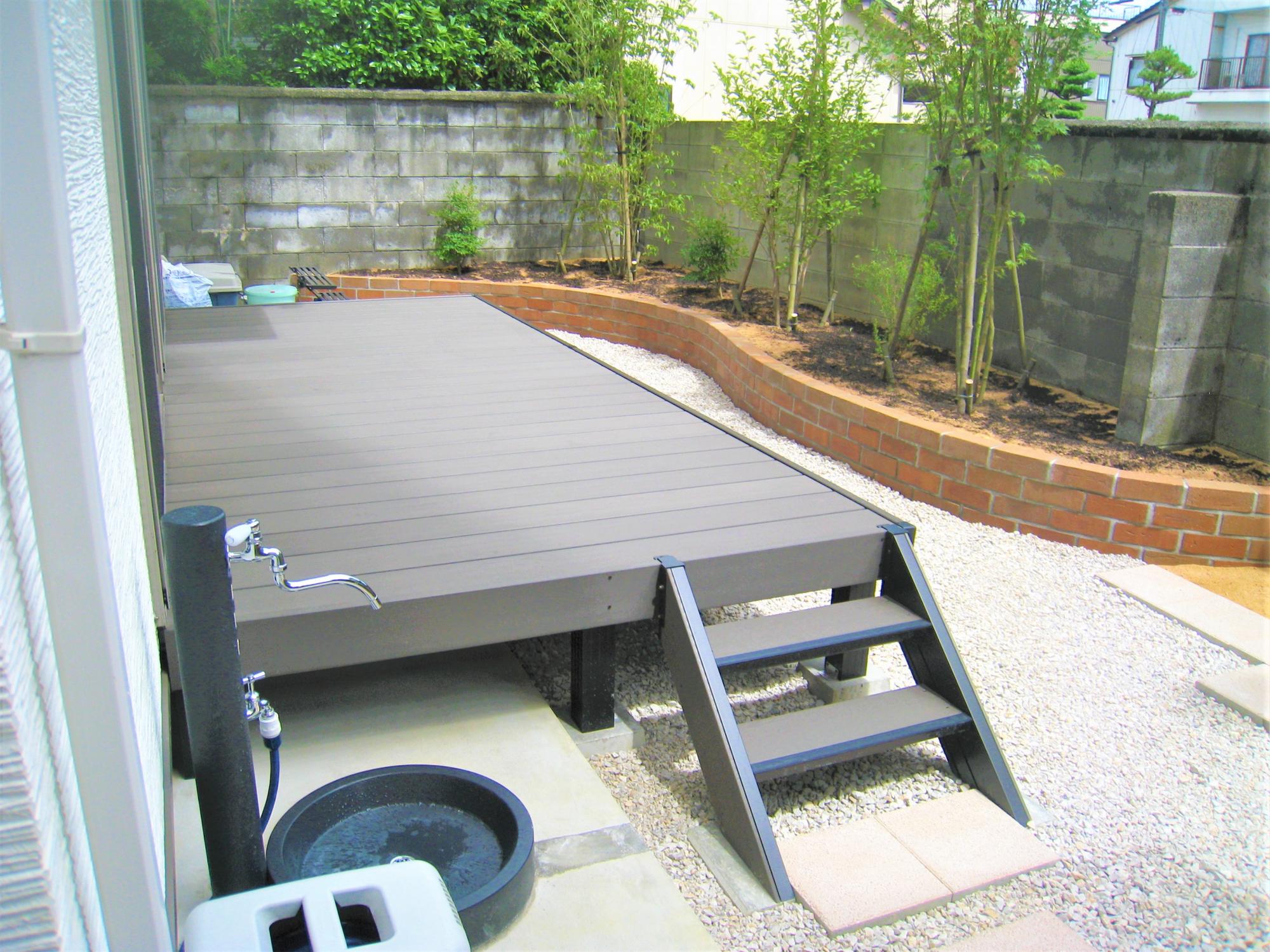 例えばこちらはYKK AP社のリウッドデッキ。商品名の由来にもなった「リウッド(再生木)」を利用した人工木のウッドデッキです。主原料は再生木の木粉とプラスチック(ポリプロピレン)。吸水率が低いので腐食が起こりにくく、菌類による腐朽やシロアリの食害にも強いので、防腐のための薬品を塗る必要もありません。傷もつきにくく、ささくれも起こらないので小さなお子さまやペットにも安心です。木材をつなげて作る天然木と違い、目地部分はデッキの下まで貫通していないので光が届きにくく、雑草が生えにくいメリットもありますよ。見た目も天然木に限りなく近く、自然の風合いも感じます。お庭の彩りにぴったりですね。